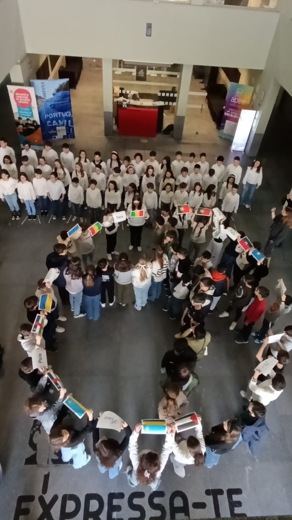 Em resposta ao desafio global lançado pela UNESCO, o Agrupamento de Escolas Camilo Castelo Branco (AECCB) uniu-se à iniciativa internacional ABC for Peace 2025, promovendo um evento que celebrou os valores universais de Esperança, Amor e Justiça. Esta ação simbólica decorreu no dia 20 de fevereiro, data em que se assinala o Dia Mundial da Justiça Social, reforçando o compromisso da comunidade educativa com um futuro mais justo e harmonioso.A celebração envolveu alunos de diversos ciclos de ensino, que deram vida a momentos inspiradores. O Clube Europeu, representado por estudantes do 1.º Ciclo e do Ensino Secundário, atuou com uma música, canção e a declamação de dois poemas originais, criados por alunos do 3.º Ciclo com o auxílio da Inteligência Artificial, demonstrando o uso positivo da tecnologia na promoção da paz.Os alunos do 2.º Ciclo protagonizaram a representação do símbolo da Paz, empunhando bandeiras de diferentes países e exibindo a palavra “paz” em várias línguas, simbolizando a união entre culturas e povos.A atividade culminou com a plantação de uma pereira, árvore reconhecida como símbolo de longevidade e resistência, representando o crescimento da paz e da justiça ao longo do tempo. Esta ação contou com o apoio do Município de Vila Nova de Famalicão, que generosamente cedeu a árvore e se associou à causa, reforçando a importância da colaboração entre a escola e a comunidade local.Mais do que um evento, o ABC pela Paz 2025 foi uma manifestação coletiva de valores essenciais, deixando uma marca duradoura no ambiente escolar e inspirando todos a serem agentes ativos na construção de um mundo mais pacífico e solidário. Que esta árvore, agora enraizada no nosso espaço escolar, seja um símbolo vivo do compromisso de cada um na promoção da justiça social e da harmonia entre os povos.